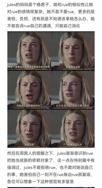 Rue可怜吗?完全没有,都是自作自受来的,说jules出轨的人你们可以想象一下对象天天带着第三个人一起玩,然后自己还动不动消失了,吸嗨了,没有性欲,还联合第三人骗自己,然后这个第三个人更理解你,跟你对象很像,对你更有冲动更温柔,这种情况下可能不动心吗?是个人都会心动的,但是jules和E的那种背叛,带着一点点惩罚rue的味道。