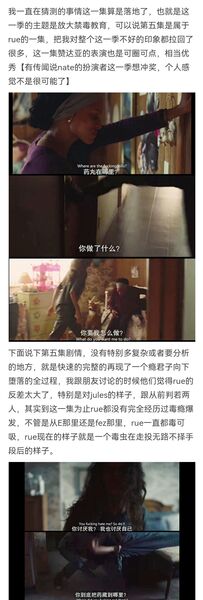 通过E的嘴也说出来rue的毒瘾已经到了多么严重的地步,海洛因,芬太尼,镇静剂安眠药,rue全部都来者不拒了。这一集结束后很多人都在吐槽jules和男小三elliont对rue的背叛,以及颠覆了特别版,但实际上这种走向基本上是无法避免的,先不看rue这个角色的阴暗面,结合主创采访 jules这个角色的特性,jules的性格问题非常明显→见一个爱一个,这场三角恋的一开始是rue将另一个人带入并与之建立稳定关系的。可以用这样的角度看E这个角色,是一个理想版本的rue,也是照着她的样子找的,这样就比较好理解接下来发生的事。