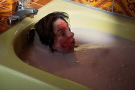 女主杀死丈夫后,跟随着润肤膏的脚印来到浴室,泡了一个润肤膏澡,这又是一个经典的人与恶魔交媾的情景。当然在本片中,这一情节也对应着女主被制成标本的过程,后面我们再分析,标本意象的对应关系,这一点很多人都看出来。