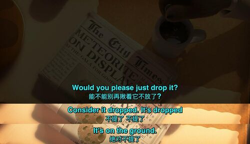 字面意思的drop it,就是把它掉下去,扔掉它。狼先生顺着说:it's dropped, it's on the ground. 就是 “已经扔了,扔到地上了”,以此来表示:嗯,不提了,这事儿我已经扔的远远儿的了。