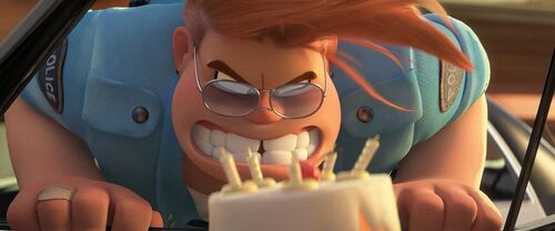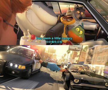 一方面它是个谐音梗,hangry和hungry发音非常相似;另一方面,瞅瞅警长被挂(hang)在两辆车之间的样子,也是非常滑稽。但还不止步于此,hangry本身其实就是hungry angry的结合,表示因为饥饿导致的愤怒。看看警长这个表情,真是非常的hangry呀~