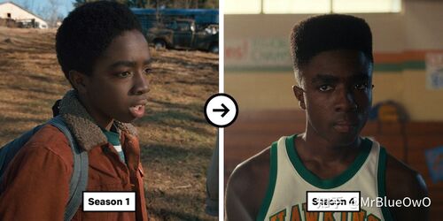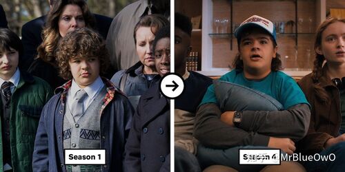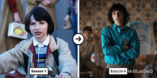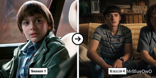 少年主角团的前后对比图如下。达斯汀和麦克斯好像还好,但是其他四位演员,尤其是威尔和迈克,猛地长大了一样,变化明显。