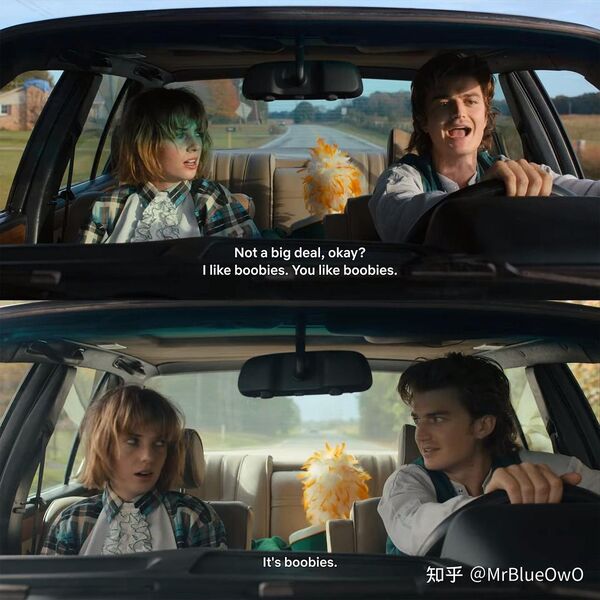 但这就引出这一段我想强调的重点了,也是本季一些支线走向的诡异之处:fan-service,粉丝服务倾向明显。威尔的“秘密”讨论热度高,那么这一季就多塞点关于这方面的彩蛋,也把角色完全建立在和好友的关系上;另外一对史蒂夫和南希也是突如其来的死灰复燃,大概率是其中一个史蒂夫角色的热度爆表,但这一季两人关系可能和第一季南希和乔纳森类似,有好感但最终无戏,然后第五季开始真正搞事情……