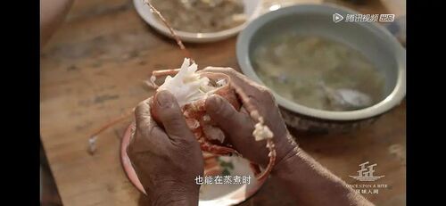 开篇的第一个故事,辽宁省大连市海洋岛李天佑一家,第一个关于吃饭的镜头就是妈妈递给女儿一块看起来像白水煮的螃蟹,而后拍到他们的餐桌,上面是整盘的螃蟹。最好的海鲜,原本的鲜甜就足够美味,根本不需要过多调味,渔家都懂得这个道理。