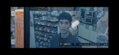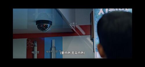 还有一个画面耐人寻味。金贤秀去超市买烟,望着超市的监控图像陷入沉思。熟悉吗?这个监控图像跟监狱里的监控像不像?