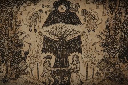 图上可以看出古代的村民试图用号角,击鼓(声音)和火把(光)与森林精灵沟通。击鼓的人是没有头的所以大概是不怎么成功的意思。骸骨,牛头代表着祭祀(牺牲)。牵手的男女中,男的眼睛被蒙蔽了但女的没有,类比于温道尔相信科学的手段但扎克不怎么信。图片上半部分带洞的石头则展示了马丁和阿尔玛被穿上崇拜用的服饰,拍下照片,被菌类孢子的迷雾包围,最终被吸了进去。