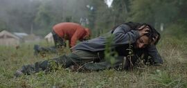 孢子迷雾包围了营地,阿尔玛试图进入却头痛欲裂。扎克留下了一个树枝扎成的人形(《湮灭》既视感)让他们感到了威胁。阿尔玛冒险穿上防护服试图穿越迷雾,在嗑药般迷幻之旅后精神崩溃又被拽了回来。——感觉这段效果能做的更癫狂一些就好了,比《腐国恶土》的效果差一些。阿尔玛不断预知般的看到了自己在影片结尾时的形象。