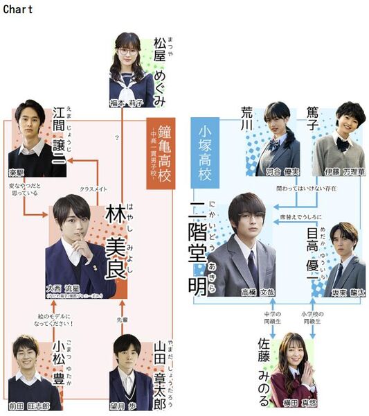 几个主要角色。首先说说神奇的小林同学。社交网络的画风是各种字体的拼接及接龙;看《遇见熊了怎么办》未不知什么时候会遇到熊做准备;爬得满身汗只是去数楼梯数……奇怪行径一大堆的小林同学,真人版是由大西流星弟弟出演。流星的豆瓣影人主页的照片过于可爱,导致我不自觉搜了下他过往的演出,原来就是几年前广末凉子那部星男里面演凉子儿子的小朋友。几年后已经出演校园青春剧的他,也到了可以演绎感情(?)故事的年纪。准确的说,漫画里并没有明朗的感情线,但无论是因为《铁与铁》结缘的松屋,还是从初中同校到高中的江间,两条线都很可爱呢。