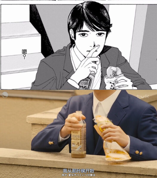 所以在我看了前两集真人版后再回头去看漫画,并没有什么割裂感。不论是奇奇怪怪喜欢干些无意义事情的小林同学,还是他总低垂着眼似乎没什么力气的江间,还包括在伊藤润二作品里出现过的二阶堂,甚至是留着郭富城同款发型明明很帅鬼脸也作得很丑的目高,都演绎得不说惟妙惟肖,也可以说80%的相似度。