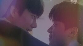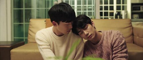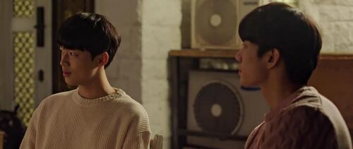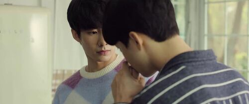 另一个场景就是撩人度满分的亲亲之后,当书俊醉意氤氲地说着“你明明可以躲开的”倒向小厨师肩膀的时候,小厨师下意识地甩开了,却又马上伸手扶住了他的头,生怕磕着碰着了。最后只能长叹一声,任由他靠在怀里。回家之后更是,明明下定决心不管他的,下一秒就忍不住开门看看他睡得安不安稳,连洗了澡再睡的flag也顾不上了,还顺手关了灯。