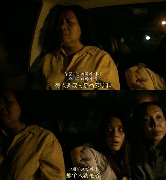 敏在开头突然大骂说有人骂她是妓女,以及敏在车上突然打关心她的婆婆,以及她醉酒后疯言疯语。