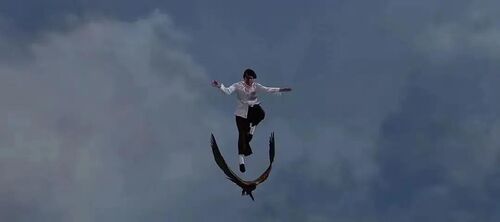 这一模式,是好莱坞歌舞片中似曾相识的至高体验,如今也可以在国产片中以虚拟的方式完成。而恰恰是这一幕,构成了和影片最后一场戏之间的有机关联,也就是唯有体验到世界运动的感觉,才会有跨越擎天柱的超越行动——这既是对过往伦理的超越,也是认知上的超越。