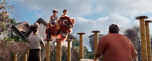 事实证明,影片的高潮部分,正是九连真人的《莫欺少年穷》将观众情绪推上了巅峰。 从五条人到九连真人,从舞狮文化到民俗风情,《雄狮少年》展现的是一种集合体式的岭南文化,它或许有浮光掠影之嫌,但也确实产生了沉浸式的体验。在我看来,它追求的是情境化——在此美中不足是未使用粤语对白,但反过来也可以看做是国语文化对岭南文化的有效收编,这种收编,类似于迪士尼/梦工厂对中国文化的收编,它的前提是地域文化应该向着更大的文化界域开放:越是民族的,就越应该是世界的。 观众对岭南文化的新奇感,对应着世界观众对中国文化的新奇感,这种开放的情境,反过来却会遭遇一种顽抗。