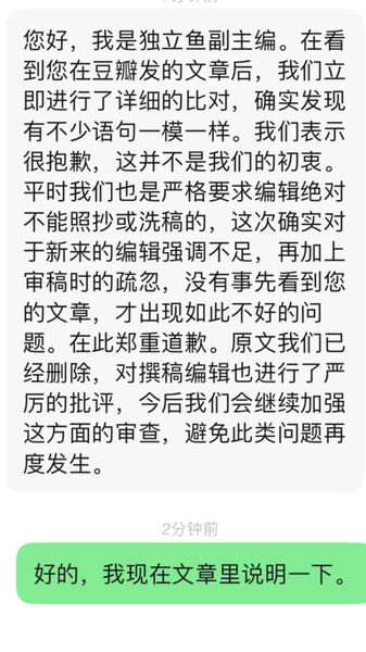 1.3更新,独立鱼电影的人联系了我表示已经删除,详情见图。虽然没有公开道歉也没有赔偿,并没直接承认洗稿,但因为本人还有二十天就要出国忙得头脚倒悬暂时没精力继续关注这件事了,可能只能如此了……创作不易,洗稿可耻,感谢评论区那位提醒我的朋友。感谢替我投诉的盆友。