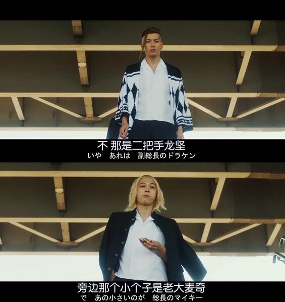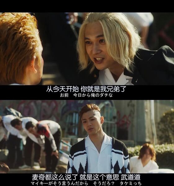 关键是这个选角太会选了!吉沢亮的Mikey小小只可爱又战斗力强,他确实也演过这类角色,但是Mikey又有点呆呆单纯的样子,这个点他也能演的相当自然。而山田裕贵的龙坚,反过来根本想象不到他适合这样沉稳可靠的角色,因为他出彩的总是一些憨憨或变态。但是这个发型,这个奇怪的发型,居然让他看起来比平时正常的发型还好看!两个人真的是靠演技把角色给立住了。