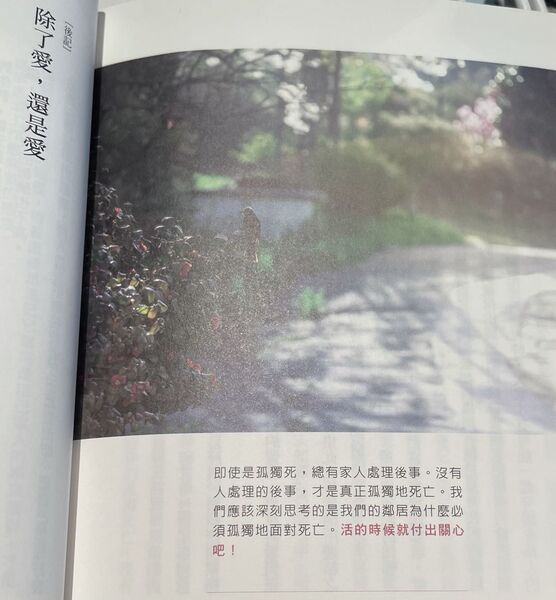 进好大学、找个好工作、买房、买车,这些事情虽然有意义,但到最后全都带不走,也不能留在身边。真正能留下来的,是我们曾经彼此爱过的记忆。爱过与被爱的记忆会一直保存很久,即使在我离开人世后,它也会温暖地覆盖着世界的某个角落。你与心爱的家人有多常见面、吃饭、聊天?如果因为现在很忙、有急事,所以延期,等以后想去做时,也有可能会无法实现。只要想象一下在自己闭眼的最后一刻,有什么事是令你最不舍而一直保存在记忆里,就可以知道现在应该立刻做的事是什么了。请与心爱的人多留下美好的回忆,它会在你人生的最后一刻,温暖地包围着你。