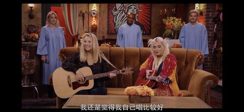 2.菲比唱smelly cat不是唱了几句就结束了,后面出来了lady Gaga拿着吉他一起唱,还有菲比签约公司后MTV中的合唱团也出现了。剧情上照应了菲比当时在咖啡馆和一位有实力的主流唱腔女歌手竞争驻唱失败。人物上lisa扮演的菲比和现实中lady Gaga都曾被看作是“异类”这一人物照应。其实这段呼应非常好,全篇删掉有些可惜。