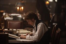 可能是太过于依赖巴尔扎克的频频金句,电影本身并不能说是出色的。其中对主角吕西安笔头功夫的描述,更是做了一场实在没有信服力的夸大场面。一出戏剧过后,像人体素描画家那样,吕西安端坐在以后成了他爱人的女演员面前,上下打量着快速动笔,完成了一篇主要赞美演技的剧评。带着复仇的笔杆子,抛弃吕西安的贵妇所属的保皇派,感受到了自由派文人的威胁。举债迁居豪宅的吕西安,也迎来了新闻皇冠加冕的高光时刻。出版人上前,向跪下装作授勋的年轻人说到,“优秀骄傲的骑士,毫不畏惧也毫无原则,以不诚实、假新闻和广告的名义,我为你受洗,成为记者。”