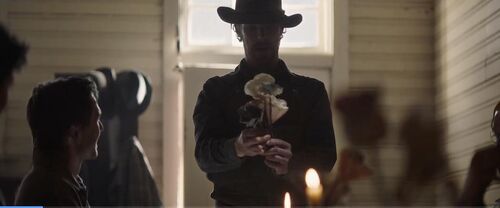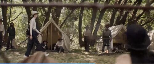 在嘲笑的口哨声中,Peter目不斜视地穿行其中,然后折返。四周的哄笑在他波澜不惊的脚步中渐渐低下去,最后陷于沉寂。所有嘲笑他的牛仔都静默下来看着他在他们之中走动。他那种波澜不惊的脚步和神色震住了这群西部牛仔。Phil一言不发的坐在一旁看着Peter,在口哨四起的时刻并没有出言维护他。但当Peter震住其他人的时候,Phil意识到Peter身上有某种坚定的、与他相通的男子气概。