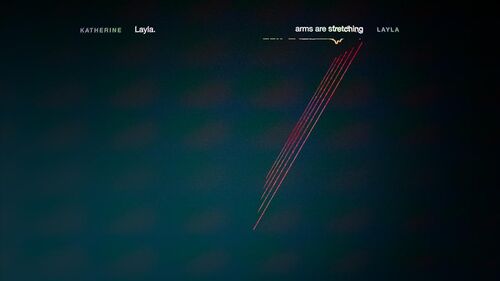 Layla告诉姐姐自己手臂正在变长,"stretching"一词开始扭动,自己所在的线条出现红色,异变和焦虑