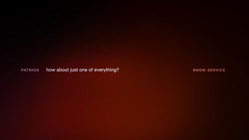 在一段制片人名单过后,画面出现在里约热内卢一家酒店的送餐服务热线,Patrick正在海边度假享受着按摩服务,享受着他的新生活,而背景颜色则呈现出暗红色
