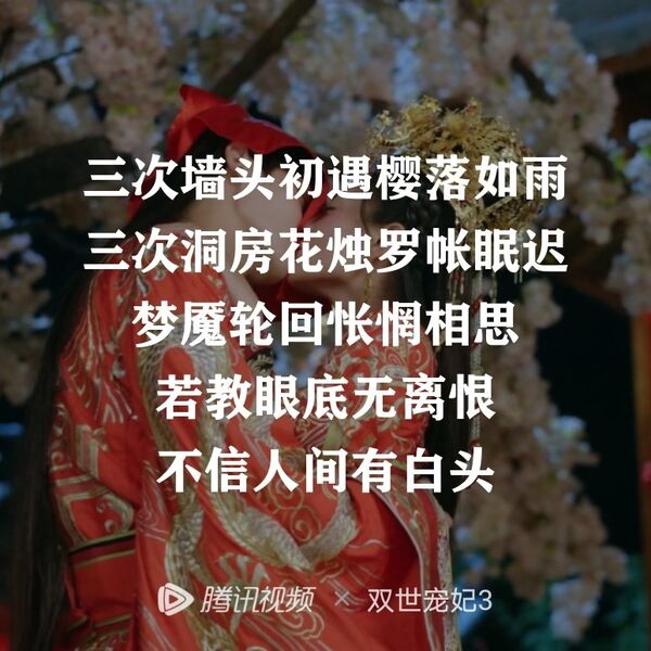 贴一则完结时写的心路历程 『一日夫妻,百世姻缘 缘定三生,恍如惊梦 三次墙头初遇,樱落如雨 三次洞房花烛,罗帐眠迟 梦魇轮回,怅惘相思 若教眼底无离恨,不信人间有白头。』 特意截了城城受伤之后一夜间恢复三世记忆的内心独白,配合着朦胧泪眼真的很戳我,最后一句引用了辛弃疾的词,贴切至极,意为“如果不是亲身遭遇离恨折磨,根本不会相信世间竟有人能一夜白头。” 超点一路看到结局感觉怅然若失,不舍之情尤甚,尤其是结尾的悬念留白并不大不知道是否还有第四季。 因此,忍不住要为她写一帖。 之前并不好意思和人说起自己在追这部打着猎奇剧情的下饭甜宠剧。 哪怕我暗自的口味有时非常喜欢猎奇。 并非所有的甜宠我都能看进去,能看上的实则寥寥无几,一句台词,一个场景可能都会让挑剔的我跑掉,除非有什么可以很吸引我的地方。 能在开始就看了第一部完全是由于猎奇,毕竟剧情就是儿时小说照进现实,太像早古玛丽苏古言,太像无限流快穿了,真的很怀念,女主好甜,金剧频出戳我笑点,bgm太好听,马老师的配音好苏,于是哪怕小成本的质感和剧情也让我坚持到了大结局。 第二部我当时没追,大概是刻板印象总觉得大部分故事的第二部听起来就会是剧情拉胯的存在,于是时间到了第三部。 大概是好奇第三部到了哪个世界,又或者好奇为什么第二部的播放量居然如此之高,以至于奶出了第三季,于是开播我就好奇点开看,遂一发不可收拾,甚至把前面剧情都补了一遍。 在我看来,第三部的热度虽然远不及前作,但是在写情写人一事上,是最佳的,甚至很多地方让我笑中带泪,很戳很感动,甚至我是很真诚地希望编剧可以继续写第四部。 很多人说这种无脑甜剧是换汤不换药,就是吻吻吻,撒糖撒糖,虽然第三部前面确实有吻戏过多之嫌,但是老夫老妻,又经历过现代社会,他们的举动也合理符合人设,何况他们的吻戏自带一种老夫老妻的温柔宠溺缱绻氛围,场景和氛围大多很美,也就可以接受,盖头吻真的是来回看。其实能顺利看下去的除了和现实相关此起彼伏的金句和梗,非常频繁的笑点,还有逻辑基本自洽的剧情,最主要的是人设细节的建立。 坦诚夫妇或者说第三部的群像人物,基本是活生生且可信的。他们都很难用单纯善恶是非来分辨,兰因絮果,求仁得仁。 如果是第一部是相遇定情,第二部是寻觅追逐,第三部就是双向奔赴,感情和个人都是愈发沉淀,可以明显感觉出,他们都不是第一部那个憨憨小檀和冷冰冰的墨连城了,第三部的他们更聪慧更温柔,也更动人了。哪怕是打着天雷滚滚雷剧的标签(毕竟穿越,记忆的转换机制确实玄幻),但却没有什么狗血误会的剧情,哪怕是看似修罗场的情景,他们也选择相信对方,坚持坚定地去爱,他们是三世的恋人。其实剧名《双世宠妃》哪怕因缘际会让他们相遇,但是最主要的是他们互相坚持相爱的决心和守护之心,如果没有就会走向另外的结局。 而且剧虽然世界构建不是非常严谨和广阔,但是逻辑脉络对于一个甜宠主题的剧来说是足够的,很多细小台词都是铺垫,无论是铺垫人物性格还是剧情。很多地方虽然表面上是梗,但是确实是很现实的问题,有的时候笑过我还会暂停下来思考一下自己的选择。人物刻画也是比较典型的,却没有什么一黑到底,每个人都有抉择和难处。 还要提最重要的一点,这样一个土尬甜的甜宠剧,很多台词真的很不错,小檀金句频出,承包我的笑点。墨连城是情话大师,真的很会说。而且作为很咬文嚼字的同学,城城同学的言辞真的很典雅且言之有物。小细节的设计贴合人物,哪怕是恢复记忆前的八公子,恢复记忆之后的城城,相同身体和面孔的心理状态都不同,这种刻画是很细腻很贴切的。而且编剧一定是认真了解过女尊小说,墨言忱和墨连城确实具备了很典型的两种女尊文男主特质。 台词和细节的优秀,包括演员愈发成熟的演技和氛围,让人物得以活了起来,我确实会相信他们是爱了三世的爱人。然后是延续三季的优秀的bgm,太能渲染了,《九张机》《归去来兮》《无情画》《念郎》《走着走着就散了》《舍得》《风一样的我》……十首歌每一首都很抓耳很好听,这点真的很绝。 很多人对第三部的褒贬不一,但是我觉得第三部最好,由猎奇甜宠向走心群像的过度,我觉得是一种进步。 第四部不知道能不能被奶出来。用心来看来感受,总是会发现它的优秀之处的。 很多剧情其实又好笑又羞耻,每日一问,演员是怎么忍住不笑场的!!! 裸奔空降的热度确实让人有点惋惜,分明第三部是用心了的。无论是服道化还是剧情人物。 而且我是真的好喜欢城城,檀檀,镜心十四他们的,我舍不得他们