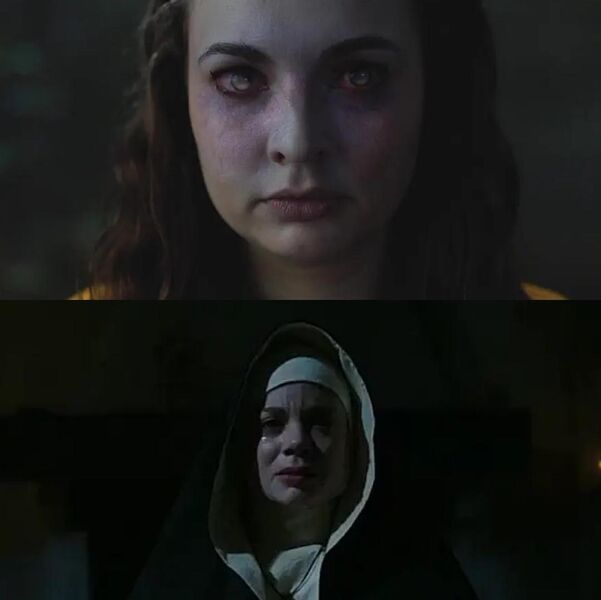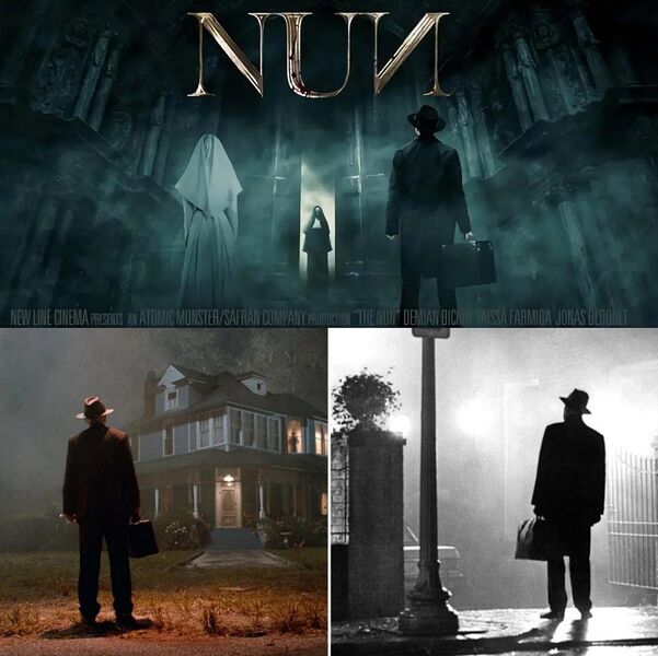 4. 招魂系列深受驱魔人影响,所以整个招魂宇宙都可以找到太多的驱魔人彩蛋,最明显的两个莫过于修女里神父伯克和招魂3里神父戈登两人的着装和站姿,几乎就是在1:1复制驱魔人的神父莫林。