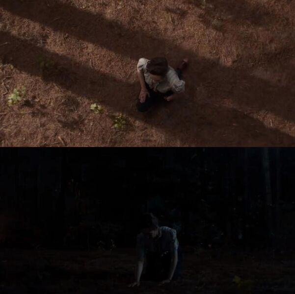 9. 有人也许觉得洛林进入树林后从白天变成黑夜的连续镜头是绿幕完成的效果,其实这段真的在树林夜晚里完成,只不过白天的效果由一组功率巨大的灯光打光,然后工作人员模仿太阳下山的轨迹配合镜头移动最终完成了这一气呵成的镜头。