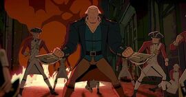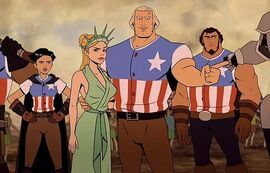 主角团:落樱神斧华盛顿,变成了汽油电锯的金刚狼加强版。山姆·亚当斯是个卖啤酒的兄弟会会长,反科学,种族&性别歧视,最后带了个帽子就是“美国召唤你”的海报梗。爱迪生是女性还是华裔,一身行头copy钢铁侠,酋长断手梗星战老传统,铁匠举个锤子还能放电宛如雷神。保罗·列威尔最开始是飙车党版(F&F?)的唐吉可德,为了救马自愿改造成机器战警。玛莎·华盛顿最后摇身一变自由女神像。