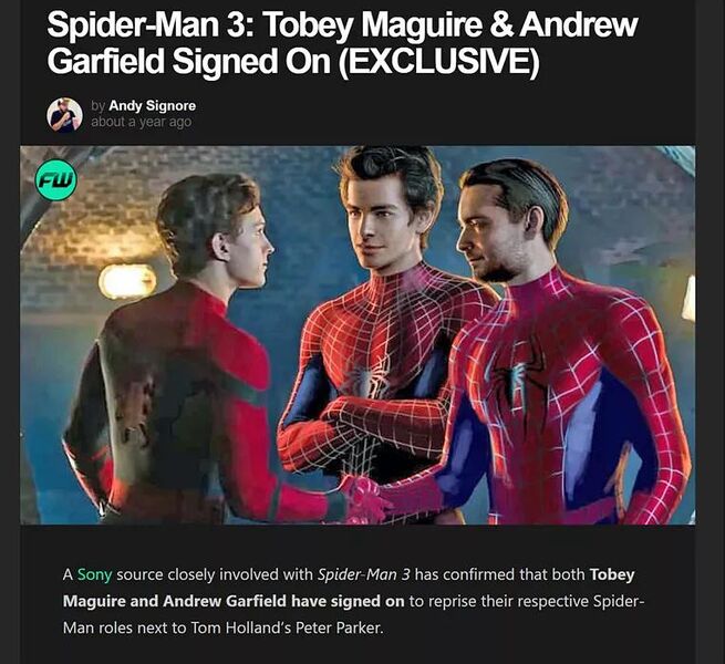 1.三蛛同框,真真假假去年十月,FandomWire独家爆料:三代蜘蛛侠将在新一部漫威蜘蛛侠电影中聚首,前两代蜘蛛侠扮演者托比·马奎尔和安德鲁·加菲尔德已完成签约。