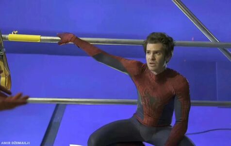 在之后几个月内,无数「疑似片场照」泄露,最出名也是最高清的一张便是下面加菲扶着脚手架的这一张。有趣的是,加菲随后在采访中表示,这张图片是PS的。几个小时以后,爆料用户仿佛斗气一般发布了一张相同情景下加菲穿着蜘蛛服在说话的短视频。