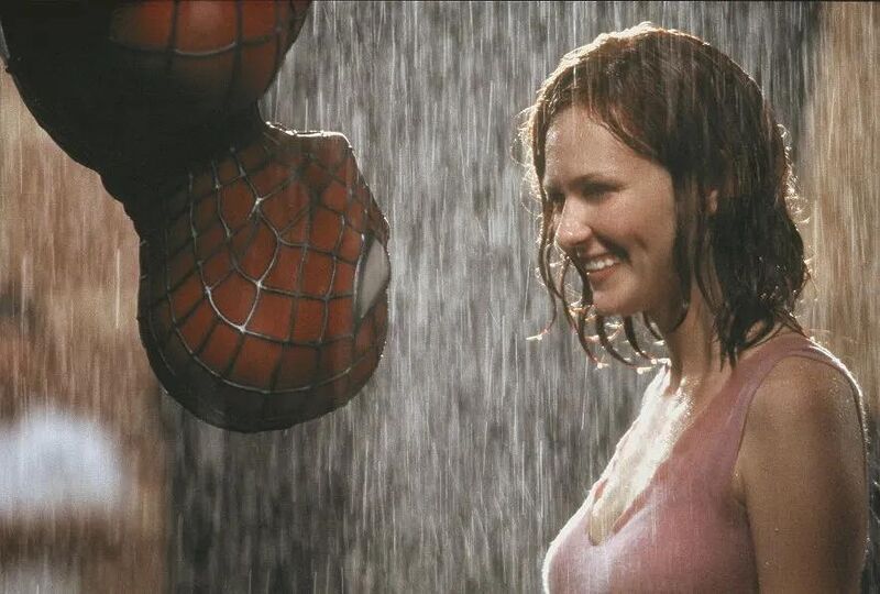 与之相对的便是MJ在初版《蜘蛛侠》三部曲里就完全是一个性符号。现如今作为好莱坞可能是最优秀女演员之一的克斯汀·邓斯特,彼时只能在这一部直男向漫改电影里面充当发福利的花瓶:无论什么天气都要在纽约穿深V露沟,以及多场雨夜激凸戏码。她游离在两位男主之间充当情感工具人,又在动作场面里变身无情的尖叫机器。也正因如此,邓斯特也莫名成为了一代宅男的性启蒙女神。