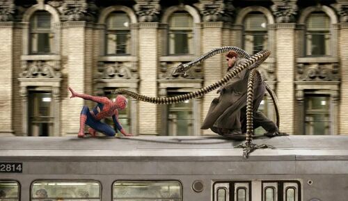 之后在内心的纠结和梅婶的劝导下,彼得重拾信心和超能力,之后的一场戏便是那个留名影史的拦地铁之战。山姆·雷米在那一场戏中,干脆把蜘蛛侠当作耶稣来拍:众人托起蜘蛛侠的身体,随后蜘蛛侠在众人的呼唤中苏醒(复活)。甚至之后被章鱼博士抓走,都要用荆棘状的铁丝来捆绑。