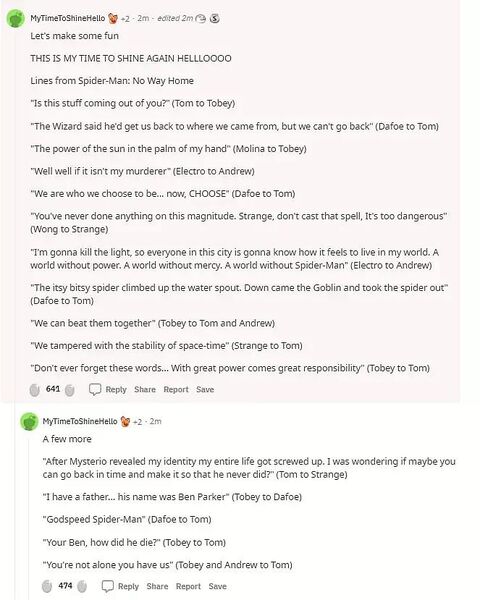 不仅如此,两个月前曾多次精准预测漫威电影情节的国外论坛Reddit上的大神MyTimeToShineHello发表了多句《蜘蛛侠:英雄无归》中的台词,而这些包含「多个蜘蛛侠对话」内容的台词又有很多句出现在了刚刚发布的预告之中。