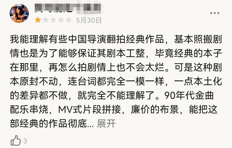 从角色的每一个动作再到故事发展的每一步走向,甚至是一个专场,一个包袱,一种情绪甚至连台词都形同饼印,如果你看过原版,这就会给人一种很强烈的重复感。
