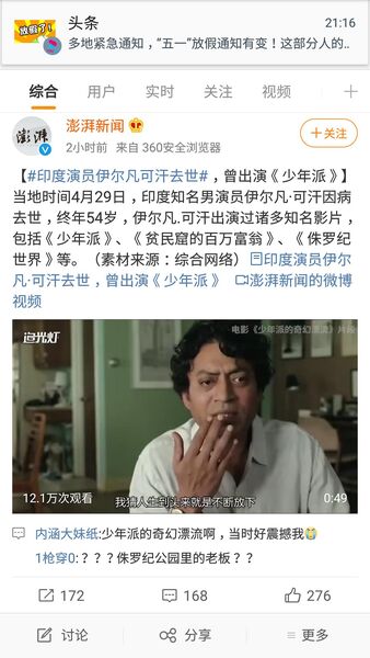2020年4月29日,印度演技巨星伊尔凡因病去世,他是我最喜欢的印度演员之一,他走了也好,毕竟之前每天都在和病魔斗争,走了也是一种解脱呀,他有太多经典电影了说一天一夜都说不完,起跑线2是他最后一部作品,最开始看这部电影时,看到凡叔脸如此苍白,我心里就很担心他,凡叔的演技无疑是完美的,废话也不想说了,现在多回味凡叔的电影,是我作为他的粉丝唯一能做的了。