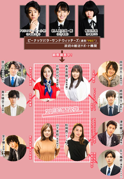 政府秘密组织“花生酱三明治”(PBS)致力于支持女性的婚活事业,通过数据解析为她们提供结婚机会率和恋爱进展的可能性分析。该组织由三位核心成员组成:新人研究员兼潜入搜查担当的椿(矢作穗香饰),秉持数据至上的资深研究员小林(伊藤健太郎饰),以及神秘莫测的所长权田(伊藤修子饰)。他们定期挑选四位女性进行深入监视与分析,运用专业手段评估她们的婚恋前景。通过这一特别机制,“花生酱三明治”旨在帮助目标女性找到理想的婚配对象,实现人生幸福。