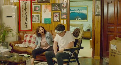 回到《便利店新星》,我不知道剧组何以安排了这样一个竖匾道具(可能综合考虑,书体没有使用安重根手写体),若让我以积极态度来看,它的出现大概在于契合崔大贤的家境环境——陈旧的老房子,父母是老一辈人,挂历、相框、老家具,配上一副具有年代感的书法,把崔大贤的家庭面貌完整呈现了出来;包括崔大贤父亲“今朝有酒今朝醉”的性格,亦和这幅字的内涵形成了强烈反差。▼