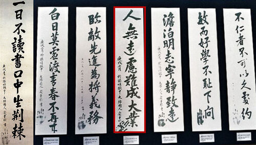 安重根所干的惊天动地的一件大事发生在1909年11月3日。那一天,他连开3枪,放倒了日本内阁总理大臣、朝鲜统监伊藤博文,世界为之震惊。安重根随后被押送到中国旅顺关东都督府监狱,在被关押的144天里,书法造诣颇厚的他在狱中留下了许多墨宝:“临敌先进/为将义务”、 “丈夫虽死心如铁/义士临危气似云”、“一日不读书/口中生荆棘”、 “白日莫虚度/青春不再来”、“志士仁人/杀身成仁”……当然,还有这句:人无远虑,难成大业。▼