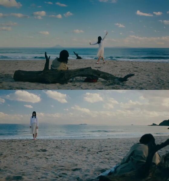 凪沙靠着沙滩上的枯木,她失明的双目始终注视着跳芭蕾的一果。