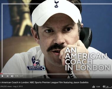可能有朋友会问:什么样的英超俱乐部会荒唐到邀请橄榄球教练执教呢?因为这部剧本身就是荒诞的产物。泰德拉索这个角色的起源是2013年美国电视台NBC为宣传英超转播而拍摄的两条广告。广告中美国橄榄球教练泰德拉索由喜剧节目《周六夜现场》的常驻演员杰森苏戴奇斯主演。泰德在两条广告里分别担任了托特纳姆热刺和莱斯特城的主教练。对足球一窍不通的他在英国闹出了不少笑话。广告通过泰德不懂足球引发的笑话,很柔顺地给美国观众普及了不少关于足球、英超以及英国的知识,可以说是广告界的经典营销范本。