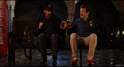 我这么做是不是太疯狂了?(Are we nuts for doing this)得到肯定的答案后,泰德只是笑了。他的冒险主义乐观精神带领着他义无反顾地向未知领域前进。每个人都是自身性格的奴隶,即便知道脚下这条路会有危险,依然只能不回头地走下去。泰德的乐观与冒险精神让他率领校队夺冠,同时也让他的家庭关系产生裂痕。在第一集的结尾,我们终于看到这个表面大大咧咧、永远在说俏皮话的典型美国人其实正在经历人生最为痛苦的战役——维持一个不再相爱的家庭。泰德选择接受英国的工作,或多或少也是为了缓解家庭矛盾。