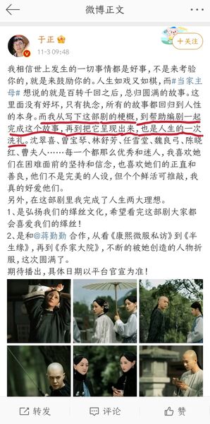 那些说我黑于正,说于正并没有参与编剧的,请睁大你们的眼,好好看看他本人发的微博。