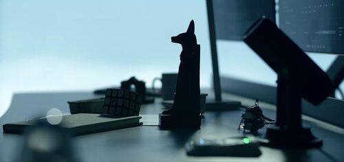 影片刚开始时有一个特写镜头:画面中央是一座阿努比斯雕像,左侧的书可以代表知识,百变魔方可以喻指宇宙,右侧的迷你太空探测器象征着探索,麦克风则意味着联结。阿努比斯是古埃及神话中的死神,它守护亡者,接引亡灵,指向来生。这与奥古斯丁一生的追求是契合的——在影片的结尾,苏利向奥古斯丁表示感谢,而他说:“我只是一个指路人。”