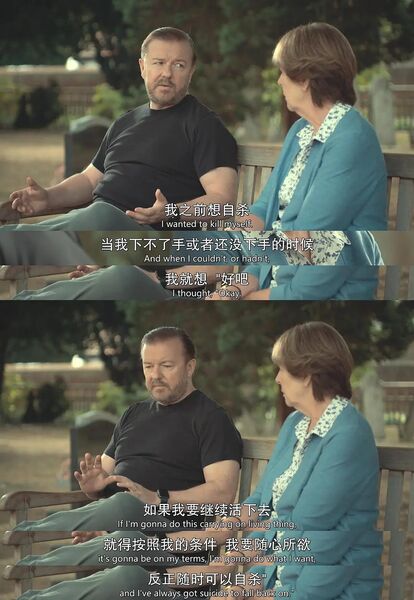 说起这部剧的额外收获,因为对Ricky Gervais的喜爱,我回去补课了他这些年来所有金球奖开场演讲和单口相声,即将开看英国版《办公室》。他是我保持痛苦而清醒,成功戒断花钱追星的原因之一。(感恩)妈的这哥们看得太透了!一查,原来是四十岁之后才走红的,四十岁之前一直过着上顿不接下顿的loser生活,自己也有丧亲经历。难怪在《后半生》里他能把那种“丧” “自我放弃” “愤世嫉俗” 感拿捏得那么准确。而他,的确就是我认识的,唯一熟悉我们底层人生活的明星。