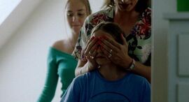 首先,她在医生组织的关于父亲变性的身份认同家庭会议中用衣服蒙上双眼,自欺欺人的认为只要自己看不到穿女装的父亲,那父亲就没变化,此时她的内心呈现出对父亲的排斥,现实中发生改变的父亲和她心中的父亲形象是不一致的。此处的摄像机镜头也一直没给父亲正面的拍摄直到小女儿摘下面具。