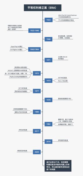 《平等权利修正案 (ERA)》历史简介ERA意在保障公民无论性别均享有平等的法律权利,旨在改善薪酬平等,家庭暴力,孕妇歧视等。ERA早在20世纪初就被拟好了,这个修正案也曾得到艾森豪威尔,尼克松,肯尼迪等总统的支持。但一直到1972年,国会参众两院才表决通过,但还需四分之三的州批准才能生效,即50个州里需38个。1973年已有30个州通过,但同期对ERA的抵制也开始了。1980年共和党政纲删除了ERA,里根公开反对该修正案。在最后批准期限之前,仍差3个州,所以ERA未能生效 (具体时间线见文末图片)。在1972年至1982年间,各种民调显示,民众对ERA是很支持的,这也包括那些没有批准ERA的州。但最后为什么没有生效?这就要提到挫败ERA的关键人物:Phyllis Schlafly