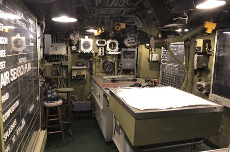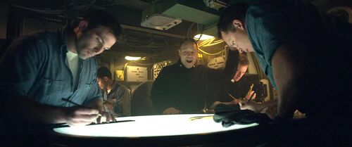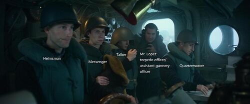 真实的CIC,人员包括CIC主官(片中由XO兼任)、雷达操作员、绘图员、记录员、电话通讯员等等。USS Kidd在战争后期的CIC极为拥挤,多达12人挤在小小的空间里,毕竟对空对海对潜都要专人负责,还要确保所有信息能准确传达到舰长、各炮位、鱼雷发射部门、高炮等。
