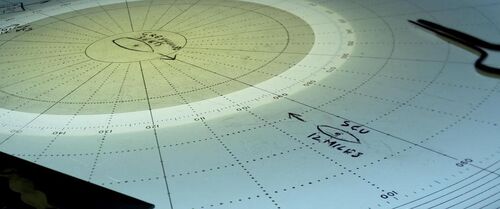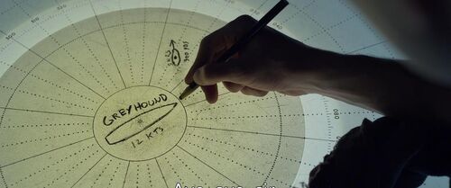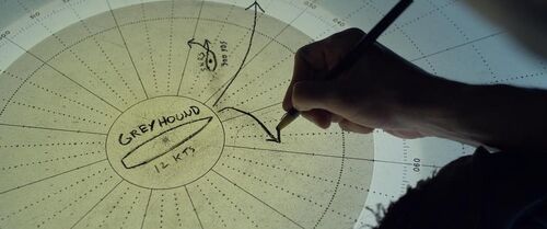 电影中CIC绘图板上标注的是以灰狗号为中心的绝对方位坐标图。即000为北,090为东,180为南这套,完整的坐标是类似下面这样的。这个点先记在这里。