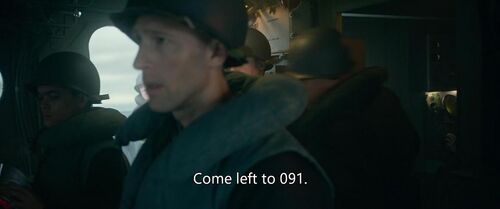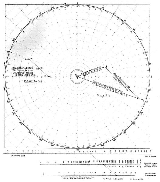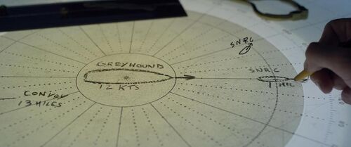 6. 声纳官先报告,右舷01,即正前偏右舷1度有潜艇噪音。但随即报告左舷015,距离1100码有接触。舰长再次打左满舵跟上。计算可知此时灰狗号航线的绝对方位是051.